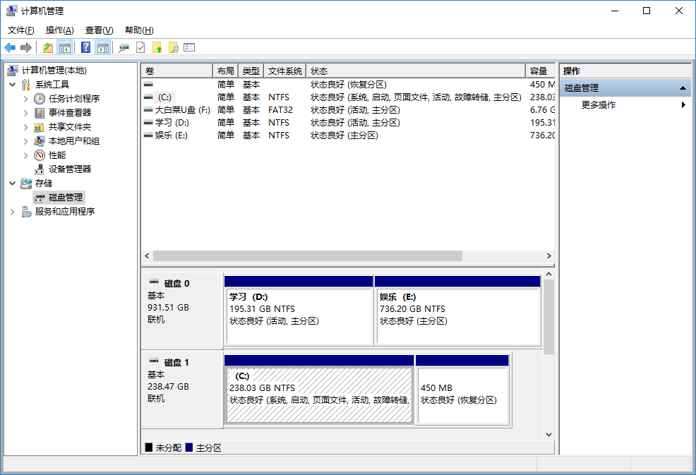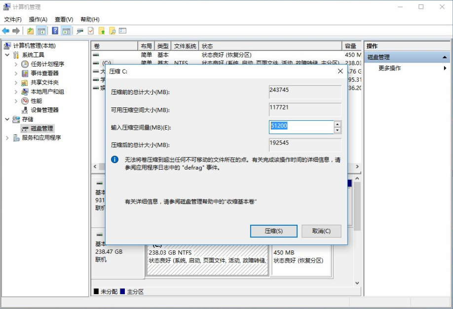 首先进入计算机管理,因为我的C盘中是固态的,所以我决定分出C盘50G给我的Ubuntu系统。