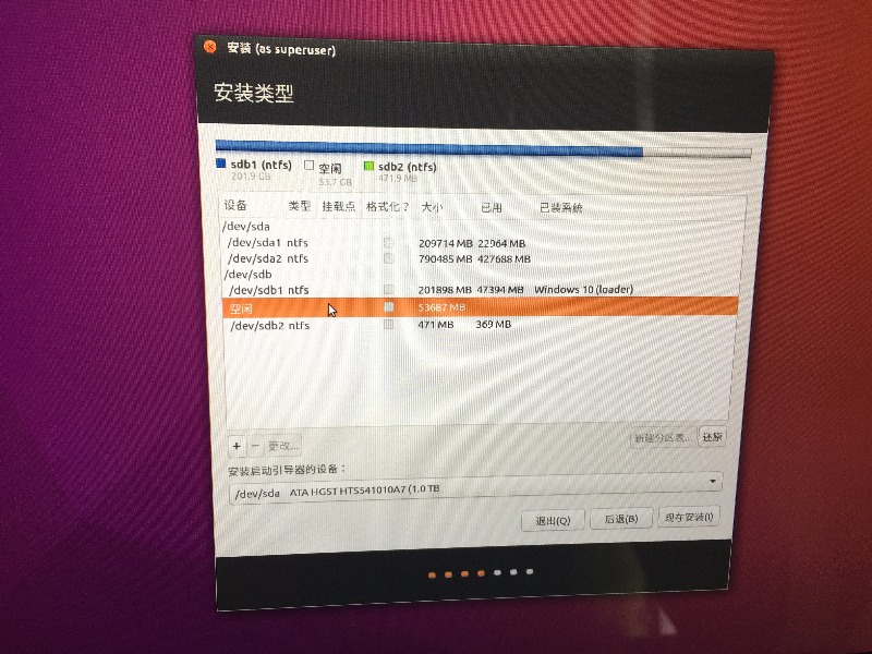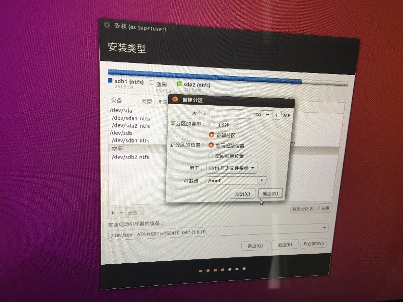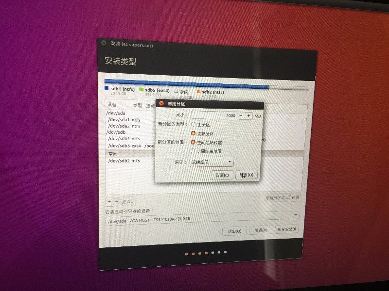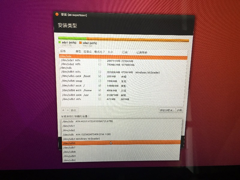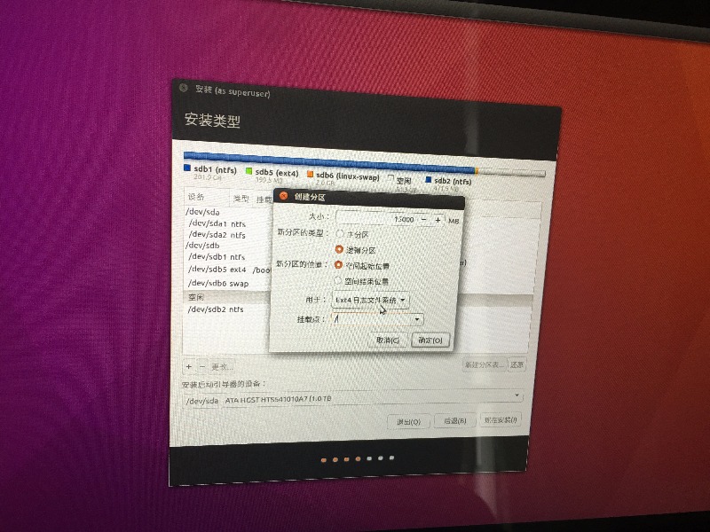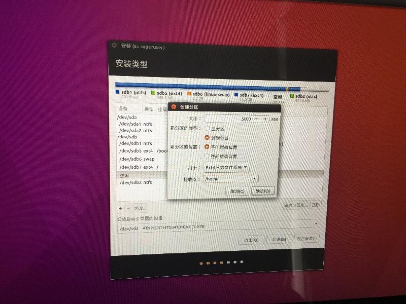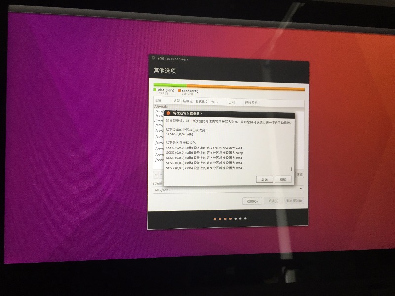 分区完了之后,选择安装启动引导器的设备为挂在/boot的分区,在本次安装中我们选择/dev/sdb5。之后的“其他选项”页面我们点击继续。
