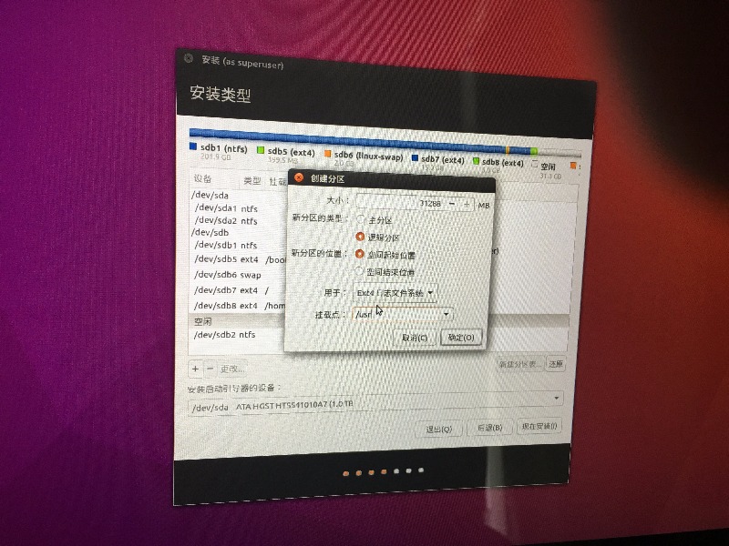 | 31288MB | 逻辑分区 | 空间起始位置 | EXt4日志文件系统 | /usr |