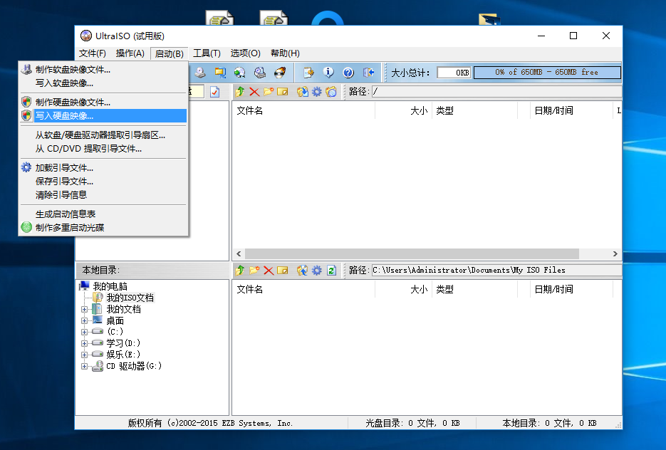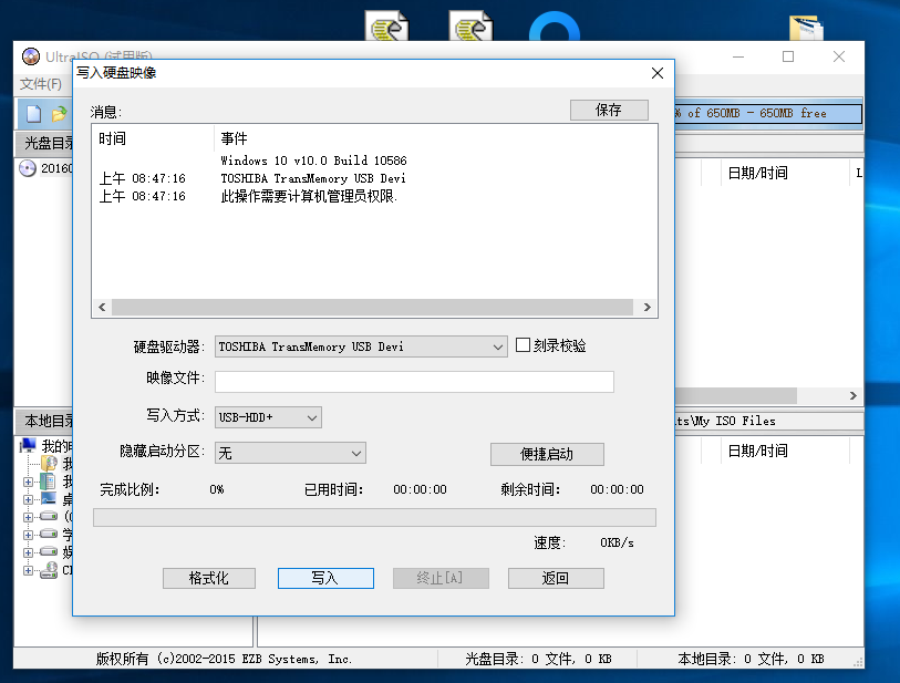 首先,打开ultraiso,点击菜单栏上的“启动”下的“写入硬盘映像”,之后配置硬盘驱动器为你用来制作镜像的U盘,并设置写入方式为USB-HDD+,点击写入,稍等片刻,我们的U盘镜像就制作好了。