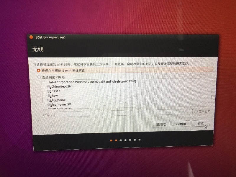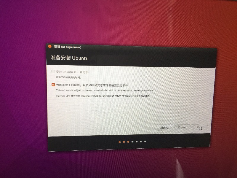 首先,我们点击安装Ubuntu,之后会让你选择无线,这一步可以选择连或不连,我选择不连是因为这样之后不会乱更新东西,点击继续会进入“准备安装Ubuntu页面”,上面的”为图形或无线硬件,以及MP3和其他媒体安装第三方软件“可选可不选,点击继续。